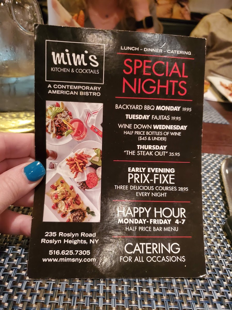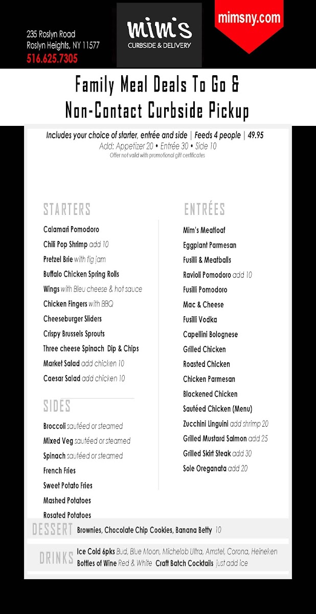 Welcome to Mim's Restaurant, a cozy eatery nestled at 235 Roslyn Rd, Roslyn Heights, NY. This charming spot offers an eclectic menu that beautifully combines classics with creative flair. Diners can indulge in delightful appetizers like the Blackened Chicken Quesadilla and Crispy Brussel Sprouts or savor hearty main dishes such as the flavorful Grilled Steak Sandwich.
